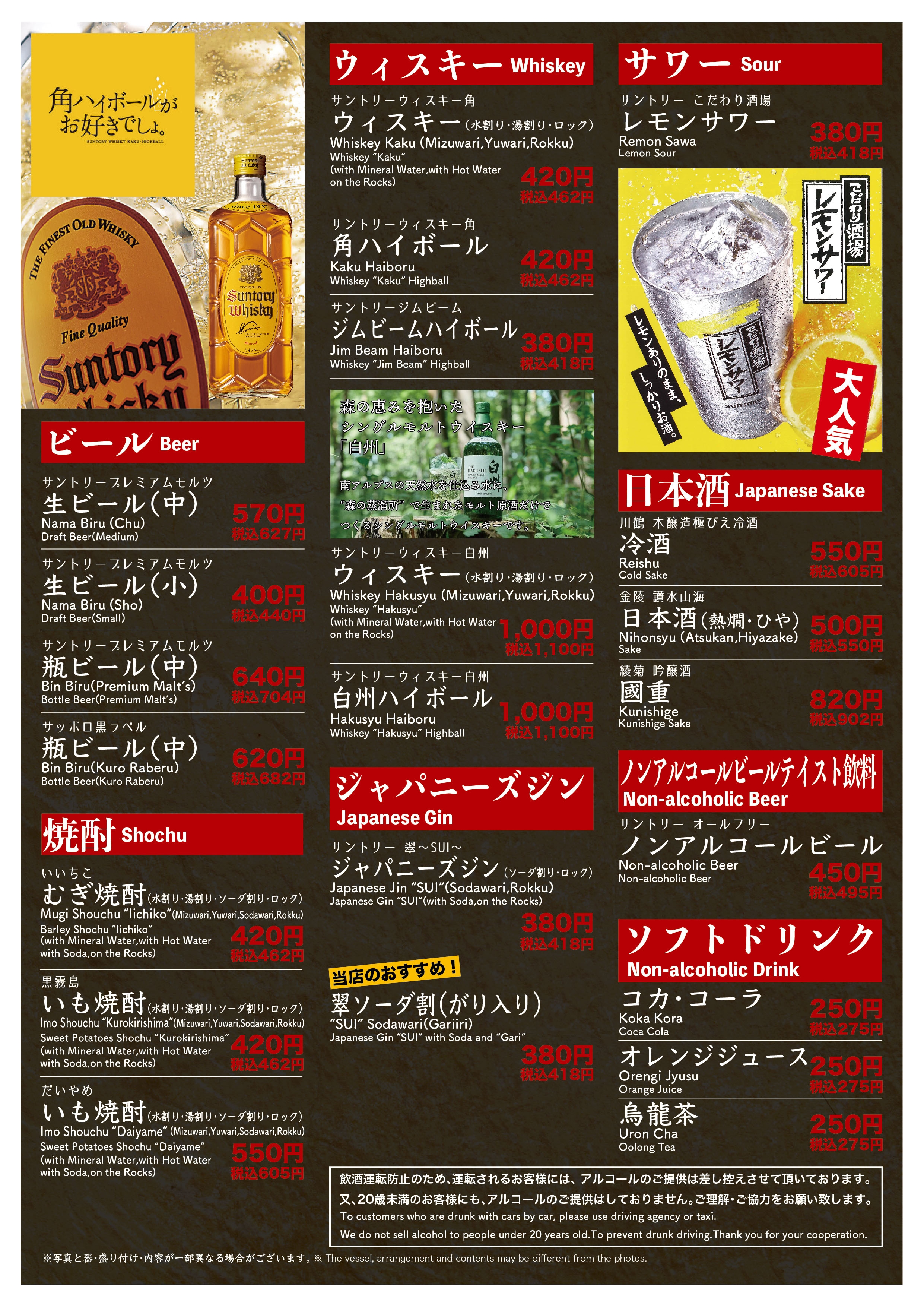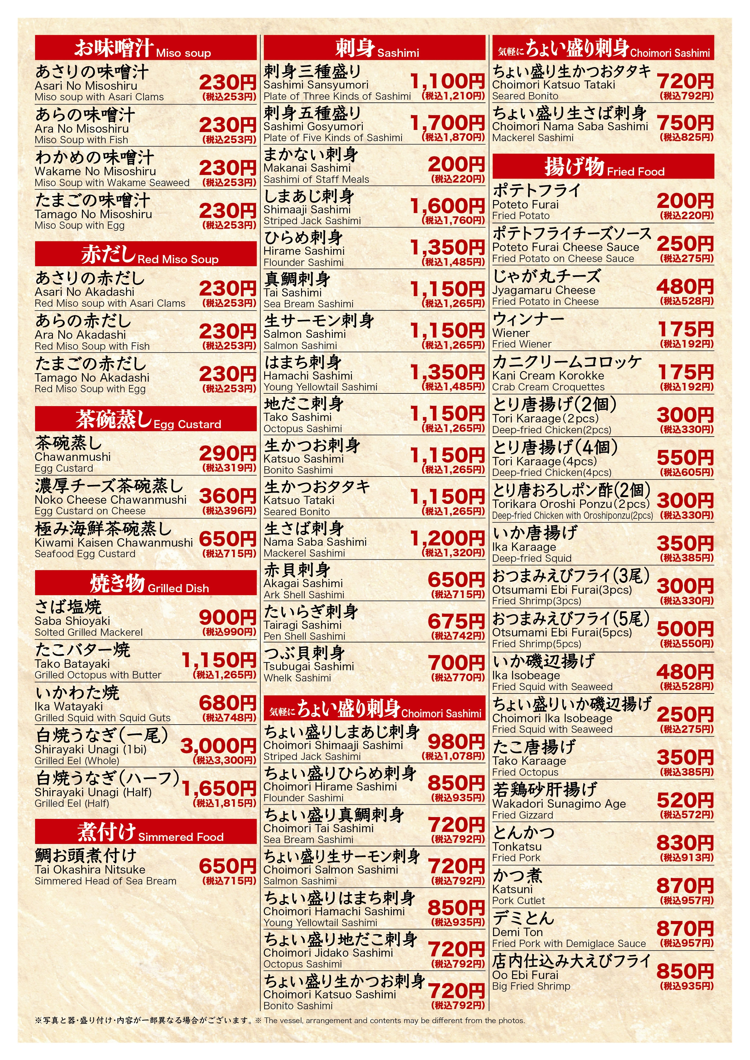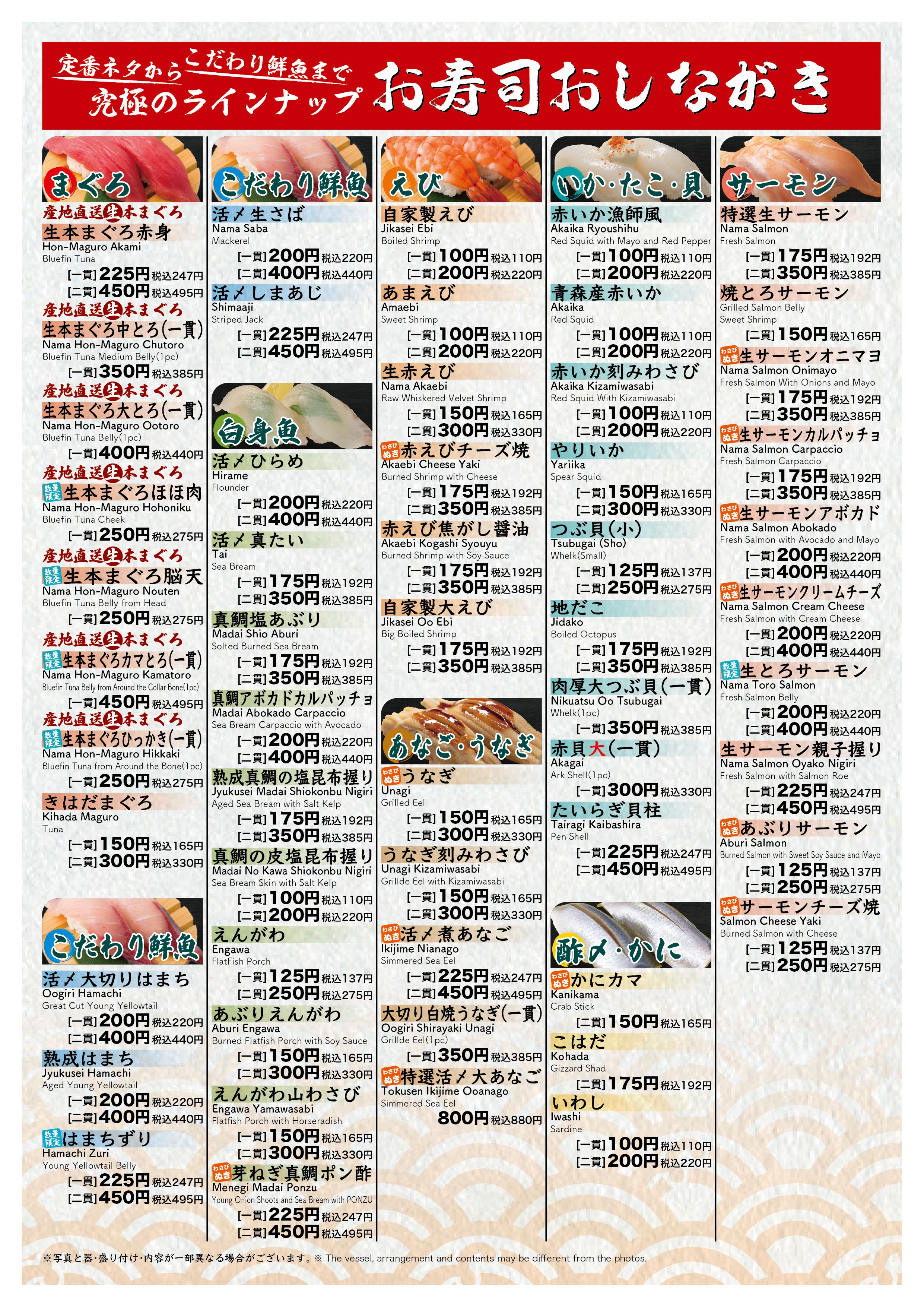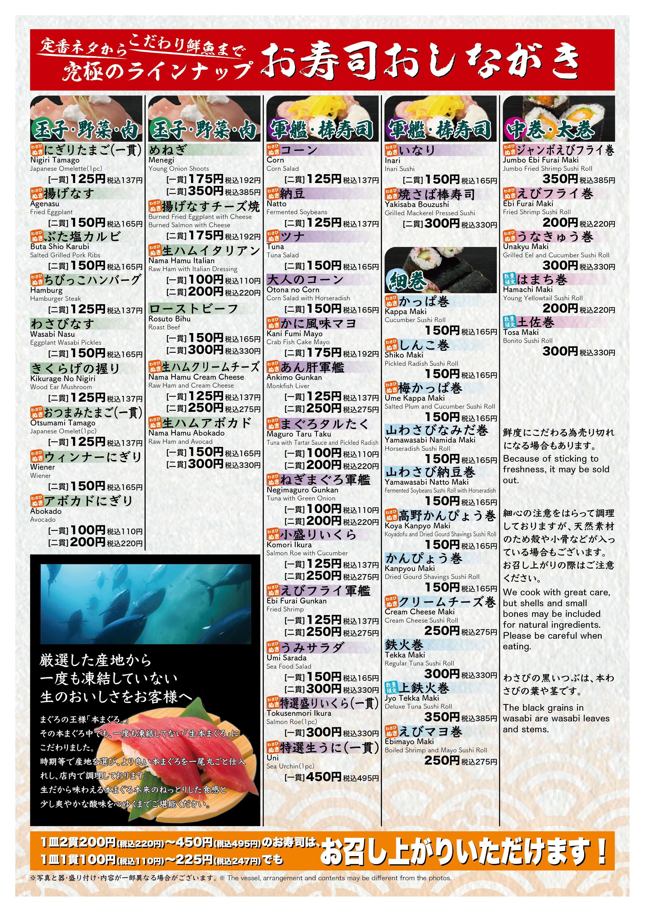 空港通り店 寿司メニュー裏